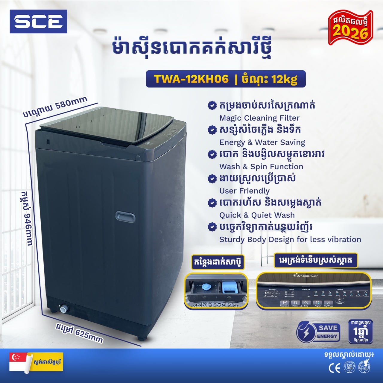 ម៉ាស៊ីនបោកគក់ថ្មីSCE សេរីថ្មី 2026 មកដល់ថ្មីៗ ✨ 📦 ធានាគុណភាពល្អខាងបោកសម្លៀកបំពាក់✨ ✅ ជំនាញបោកគក់បានស្អាតល្អ 8kg - 10kg - 12kg - 15kg ✅ មានតម្រងចាប់សរសៃក្រណាត់ (Magic Cleaning Filter) ✅ សន្សំសំចៃភ្លើង & ទឹក (Energy & Water Saving) ✅ បោក និងបង្វិលសម្ងួតខោអាវ (Wash & Spin Function) ✅​ ងាយស្រួលប្រើប្រាស់ (User Friendly) ✅ បោករហ័ស និងសម្លេងស្ងាត់ (Quick & Quiet Wash) ✅ ធានារយៈពេល១ឆ្នាំពីក្រុមហ៊ុន 🇸🇬 SCE ជាផលិតផល ស្តង់ដាសិង្ហបុរី ប្រើប្រាស់បច្ចេកវិទ្យាទំនើប និងទទួលស្គាល់ដោយ វិញ្ញាបនបត្រ CE, ISO9001 និង ISO14001